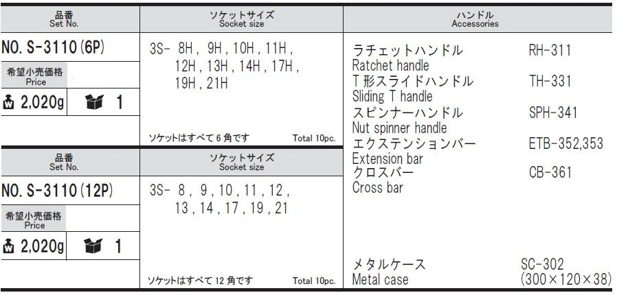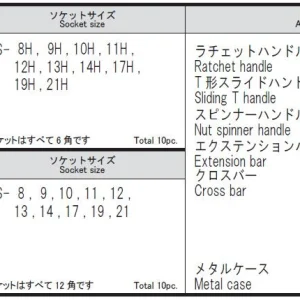 - ลูกบ๊อก 6P (3S-H) หรือ 12P (3S) ขนาด 8, 9, 10, 11, 12, 13, 14, 17, 19, 21